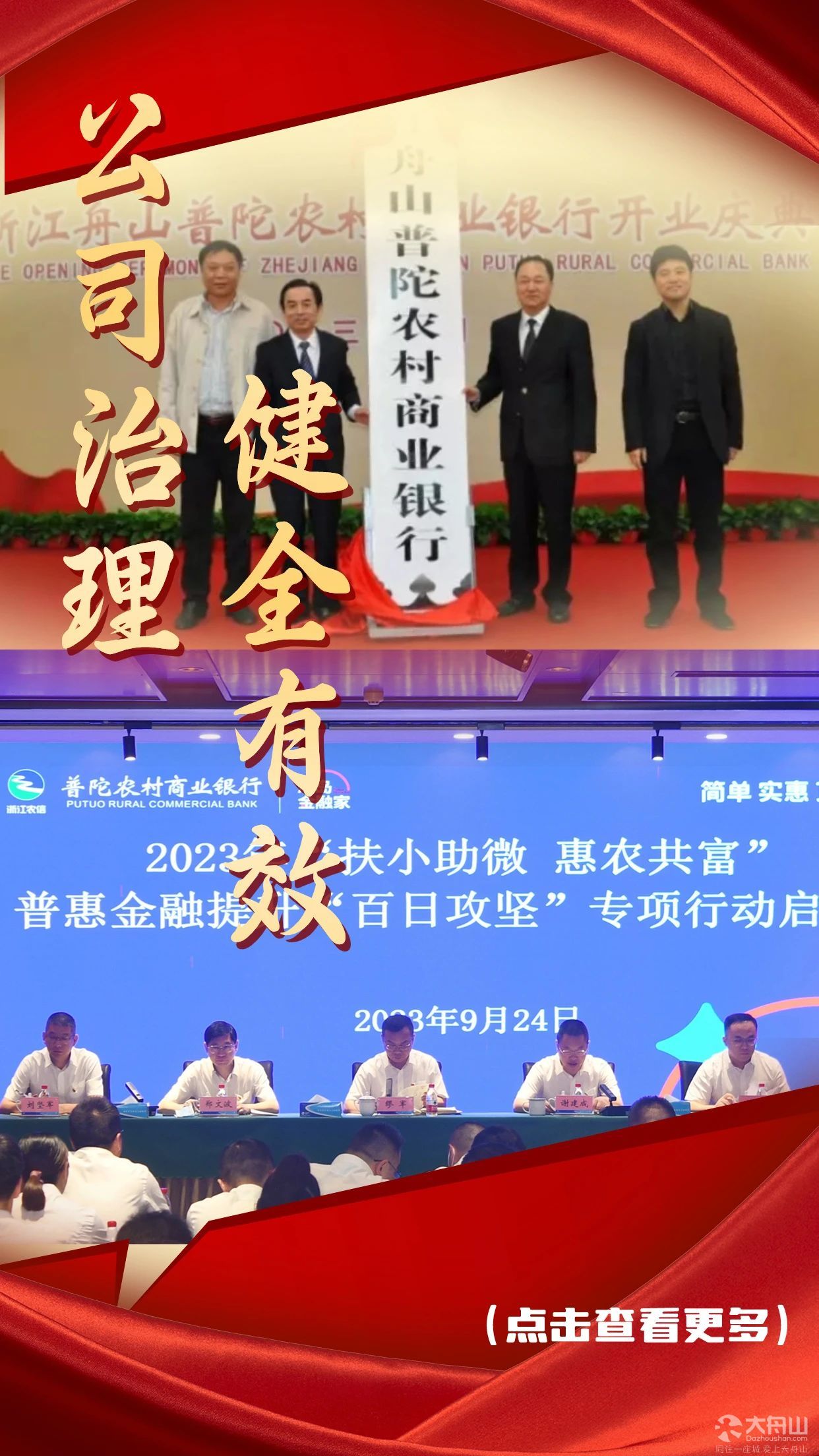 改制以来,普陀农商银行始终坚持党建引领,创新“党建+金融”模式,以高质量党建统领高质量发展。先后与区委组织部、区委政法委等近20个部门以及全区所有镇街和村(社区)开展党建联建活动,深化“两新”互动、人才引进、招商引资、新市民服务等社会治理领域合作。在蚂蚁岛挂牌设立“浙江农信系统党员教育基地”,将“海上红帆”党建联建示范点延伸到渔船上。创新提炼“海岛金融家”企业品牌文化及“合规、创新、奋斗、亲清”的企业核心价值观。持续开展“奋斗者”“最美农信人”等评选活动,连续两年总冠名“舟马”,赞助沈家门民间民俗大会,不断提升全行知名度和社会影响力。坚持金融向善理念,传播公益“善心”,倡导员工“善行”,带动社会“善为”,先后主导或配合政府设立“慈善救助基金”“未来海岛.共同富裕”等近10个公益项目,冠名基金超1500万元,获评全市首批“爱心企业”和普陀十大慈善爱心企业荣誉称号。