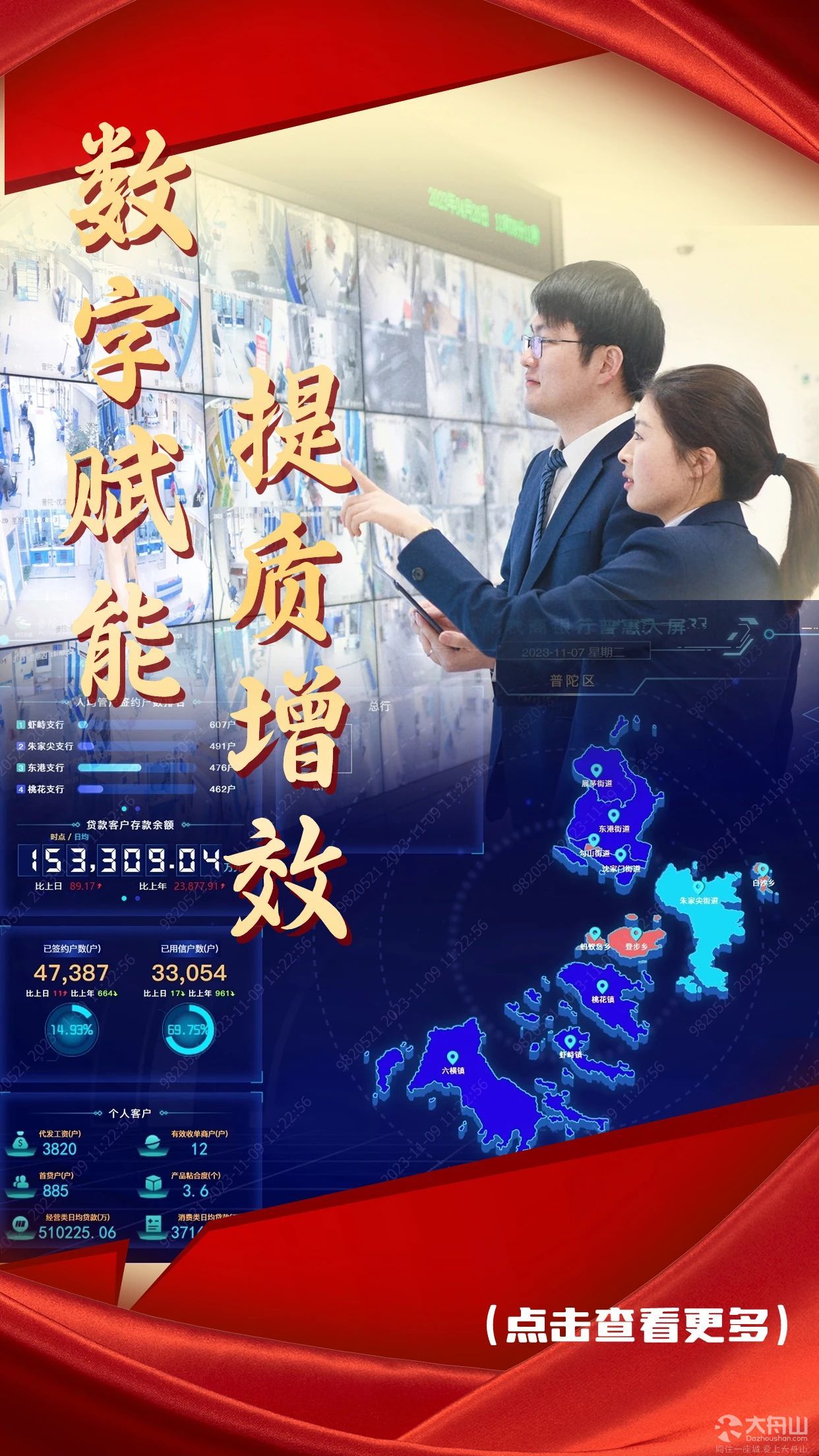 改制以来,普陀农商银行始终坚持把服务挺在最前面,以数字化改革驱动金融服务向“最后一海里”延伸。积极参与“最多跑一次”改革,不断完善“就近办、自助办、掌上办、上门办”的“四办”服务模式,持续推动“一网通办”向基础渔农村延伸,实现520项民生服务全渠道办理,累计办件超8.5万件,发放三代社保卡19.08万张。主动参与区政府数字化改革重点项目“普渔乐”、展茅未来乡村数字服务平台等平台建设,累计上线各类生态场景52个。与区旧改办合作上线房票业务系统,签发全市首张房票。大力推广“云商贷”“共富贷”“小微企业循环贷”等线上数驱产品,累计为1.59万户小微客户及个体工商户发放信贷资金18亿元。围绕资金、资产、资源安全风险管控等重点,打造基层财政管理安全风险智控应用场景,服务覆盖全区所有乡镇街道和行政村。探索推广“数字+走访”场景营销模式,加强网点转型和智慧厅堂建设,数字普惠金融的脚步扎实有力。
