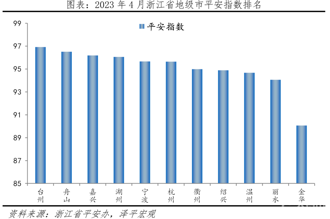 社会治安良好,平安指数以96.5分居全省第二;生态环境质量优良,重点城市中空气质量排名第三。社会安全和生态环境是评判城市宜居性的重要指标,根据浙江省平安办发布的2023年4月平安指数,舟山以96.5分居全省第二;根据生态环境部数据,2022年,舟山PM2.5年平均浓度仅14微克/立方米,空气质量优良率97.8%,在重点城市空气质量排名中为第三名,获国家森林城市、国家园林城市等称号。此外,舟山的教育和医疗、交通等基础设施相对完善。教育方面,舟山拥有丰富的教学资源和优秀的师资力量,学校重视学生综合素质和创新精神的培养,科技设施的配置比较完备。医疗方面,舟山拥有一批现代化的医疗设施,为居民提供优质的医疗服务。交通方面,舟山作为一个海岛城市,航运发达,海上交通条件优越,方便居民和游客出行。