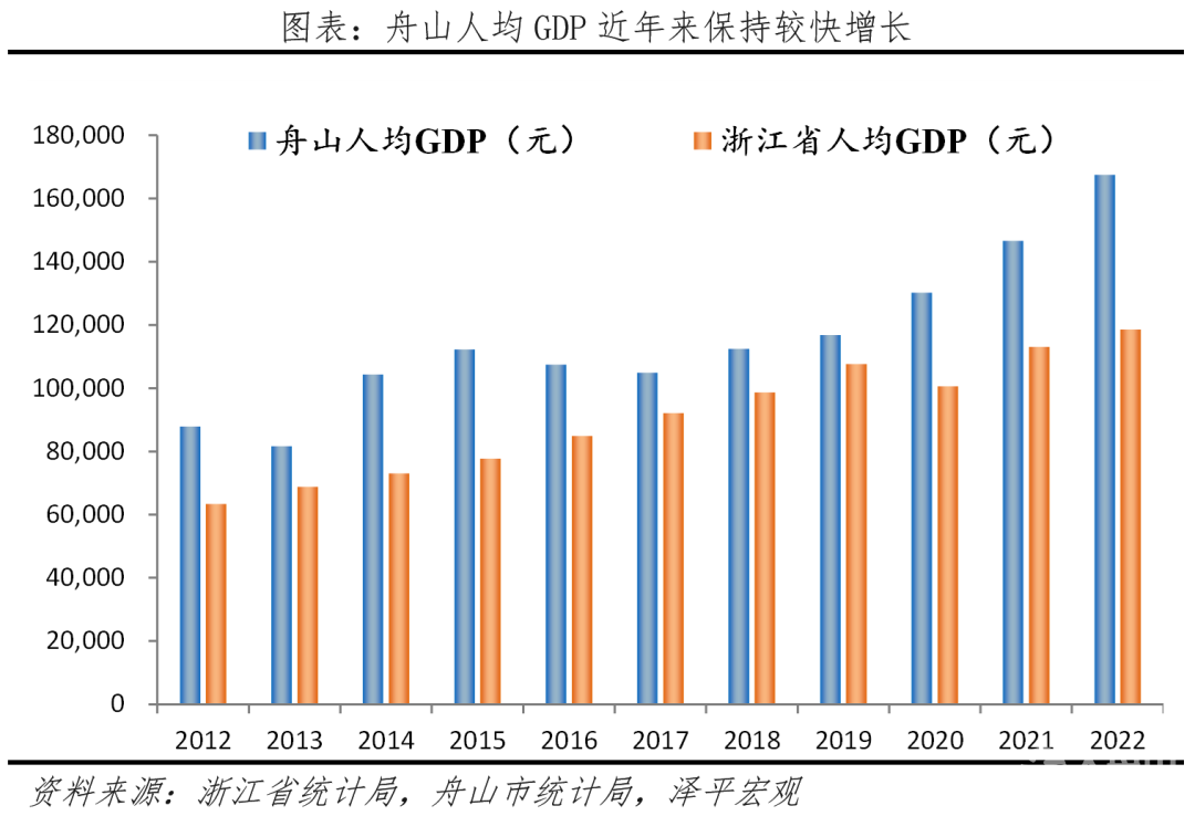 2023年舟山人均GDP17.96万元。居浙江省第1、全国第8,超过了杭州和宁波。2022年,房价收入比仅7.7。舟山整体经济体量不大,但人均GDP、人均可支配收入水平较高。舟山经济发展均衡,城乡人均可支配收入比仅1.6,是全国收入差距较小的地区之一。2022年,舟山房价收入比仅7.7,在十大最具幸福感城市中最低,居民购房压力较小。