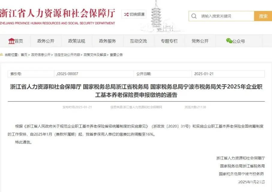 根据《浙江省人民政府关于规范企业职工基本养老保险省级统筹制度的实施意见》(浙政发〔2020〕31号)和实施企业职工基本养老保险全国统筹制度的工作安排,自2025年1月(费款所属期)起,我省参保用人单位的缴费比例调整至16%。