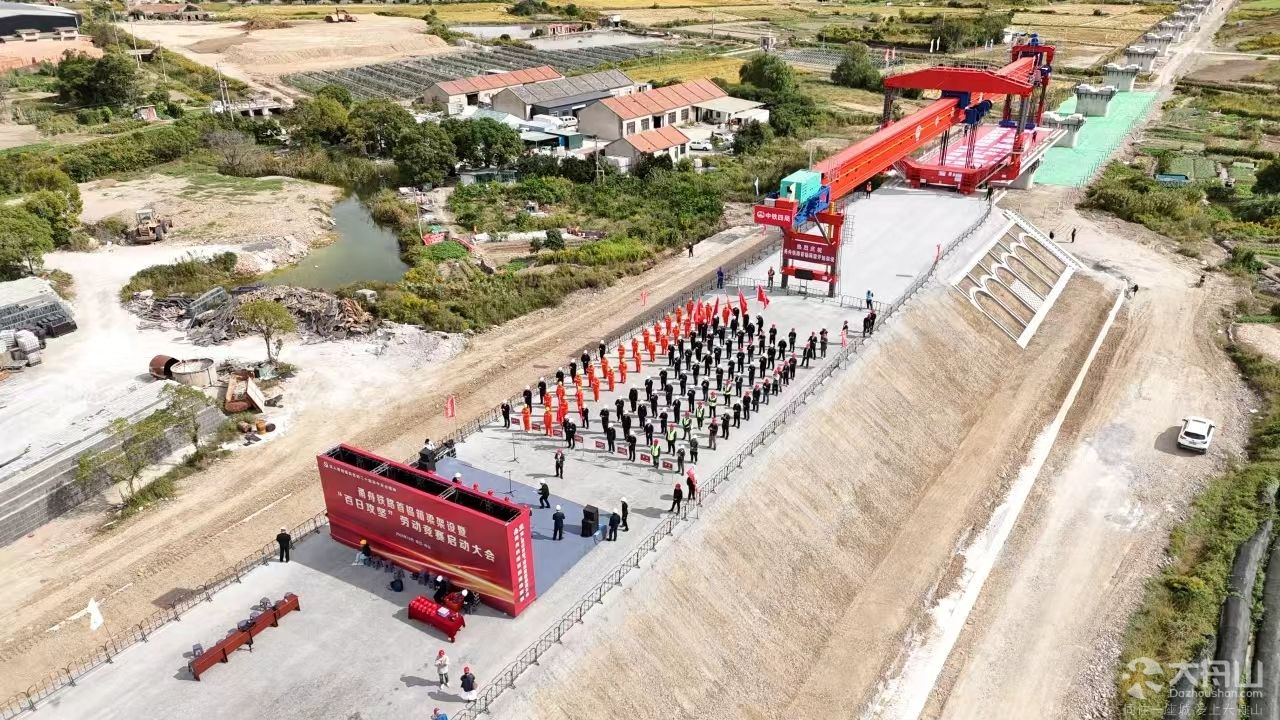 10月28日上午,甬舟铁路首榀箱梁架设暨“百日攻坚”劳动竞赛在新建宁波至舟山铁路(简称甬舟铁路)马岙特大桥建设现场举行。