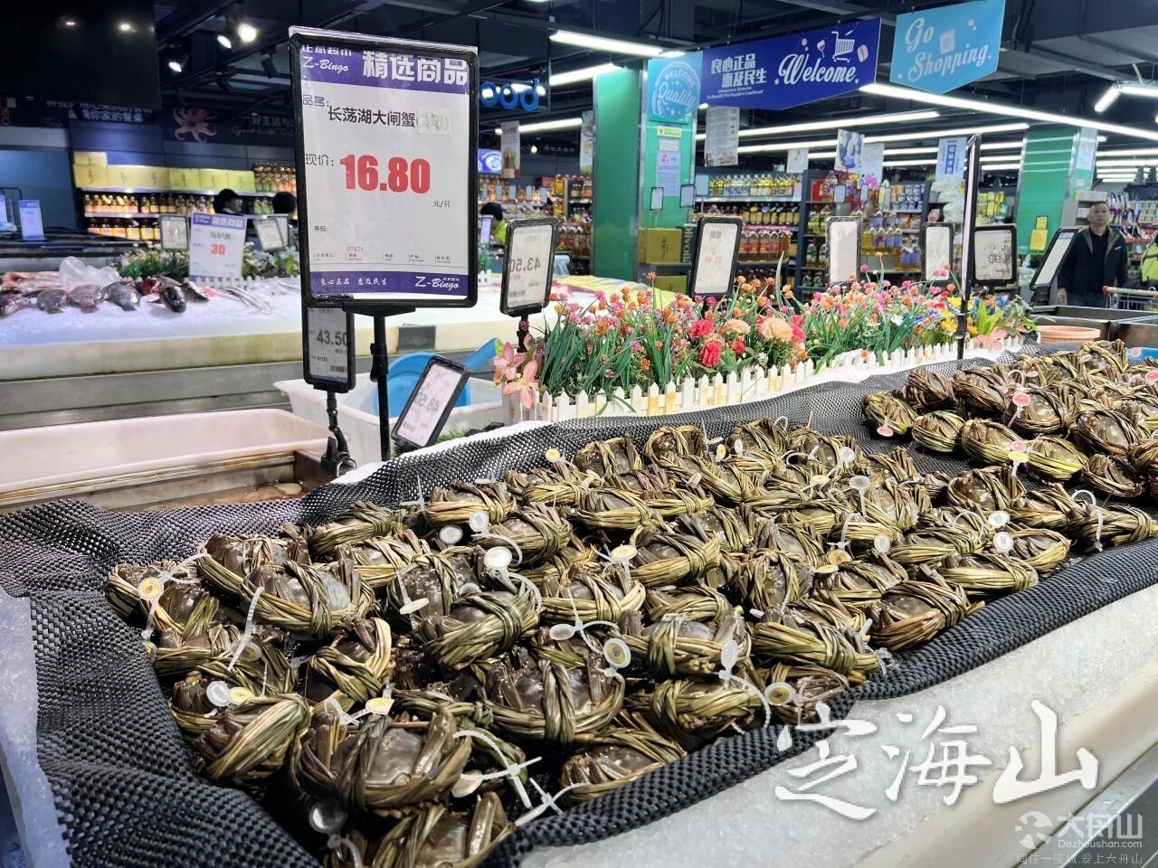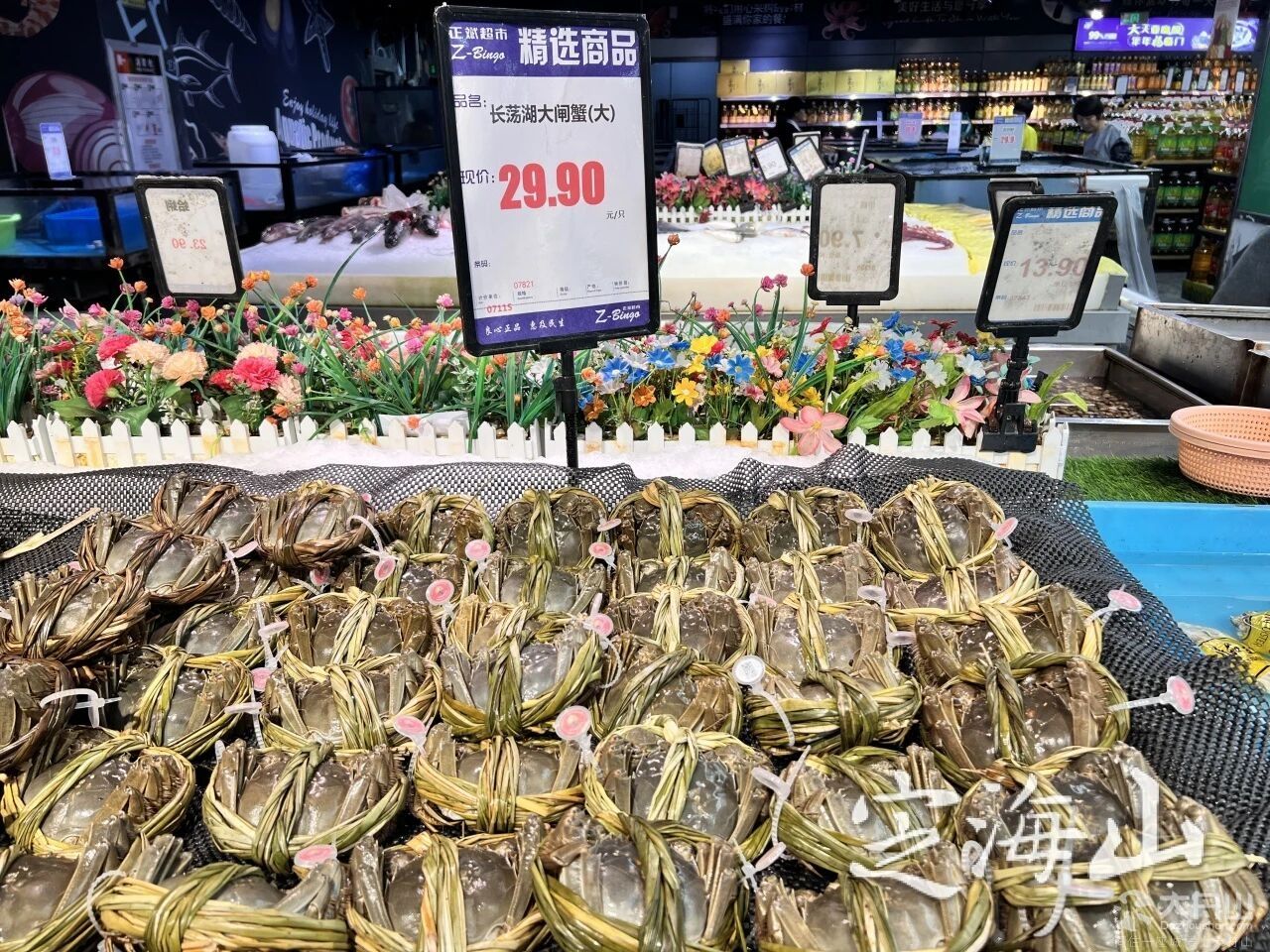 与此同时,超市的大闸蟹价格也同样有所回落。在正斌超市(舟山店),水产销售区不时有顾客挑选螃蟹。3两的鲜活公蟹售价39.9元/斤,而单只售卖的2两母蟹价格在16.8元/只,价格较上月相比也有回落。
